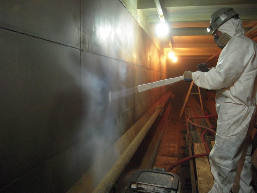 Snow White Services tested and developed a cleaning protocol using dry ice blasting. Dry ice blasting equipment mixes dry ice (solid carbon dioxide, CO2) pellets with compressed air. The compressed air accelerates the pellets through a blast hose near supersonic speeds. As the solid carbon dioxide exits the blast nozzle and impacts the surface, the solid CO2 converts to a gas (sublimation) and the rapid gas expansion of CO2 facilitates the removal of the surface contamination.