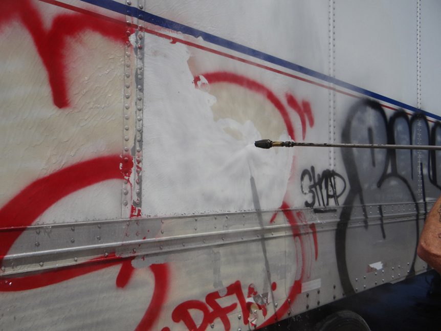 For applicable projects, Snow White Services uses high pressure dry ice blasting equipment to remove failing paint.